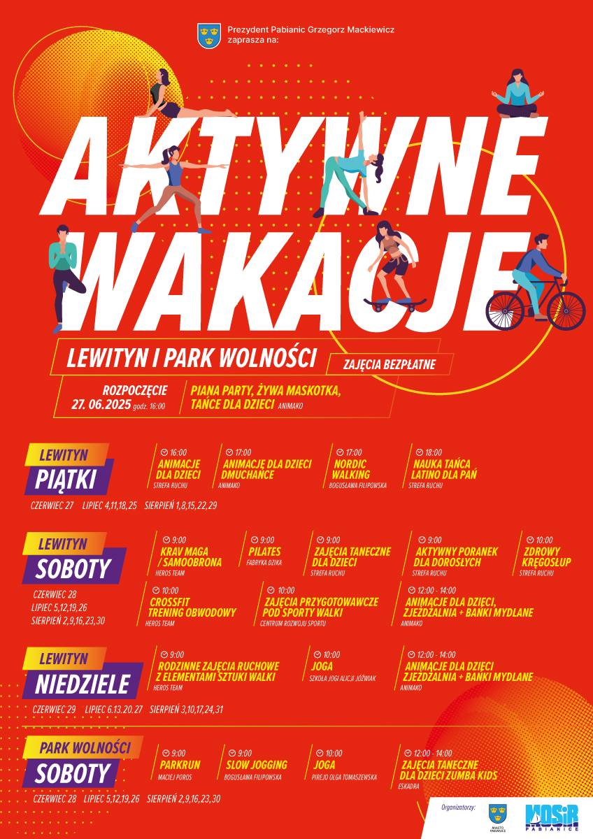 Opublikowano 24 czerwca, 2025Opublikowano w Aktualności ZAPRASZAMY NA BEZPŁATNE ZAJĘCIA WAKACYJNE Aktywne wakacje Nawigacja wpisu Konkurs ofert na wyposażenie strefy rekreacyjno-wypoczynkowej w sprzęt i urządzenia służące organizacji działań integracyjnych i prorodzinnych mieszkańców PabianicWakacje MOSiR Pabianice